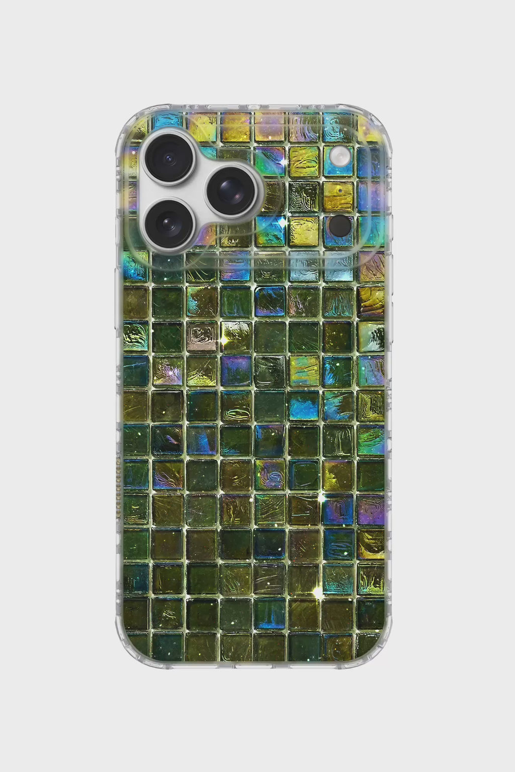 This profound design features a deep, almost black mosaic, subtly adorned with elusive iridescent hues of blue, green, and violet. Each textured tile forms a cosmic grid, hinting at hidden energies and a vast, enigmatic universe. It's an accessory that brings mysterious elegance and robust protection to your device, perfect for those drawn to the unseen depths.