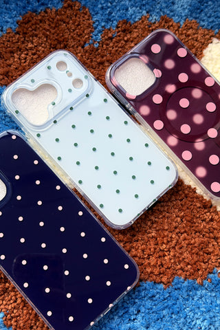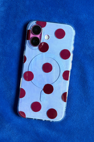 Make your heart pop with sweetness with our "Cherry Heart Pop" phone case. A light blue background is adorned with scattered red cherries and sweet white hearts, creating a charming and lovable design for your phone.
